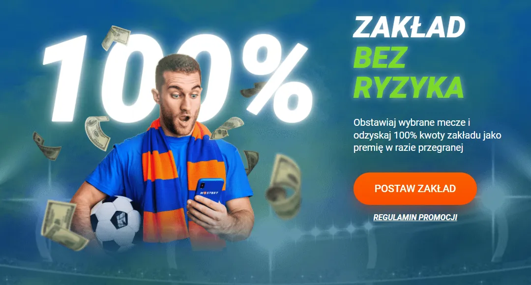 - Zakład bez ryzyka — cashback dostępny jest też u bukmachera i pozwala uzyskać 100% zwrotu za obstawianie wybranego przez MostBet wydarzenia sportowego.
